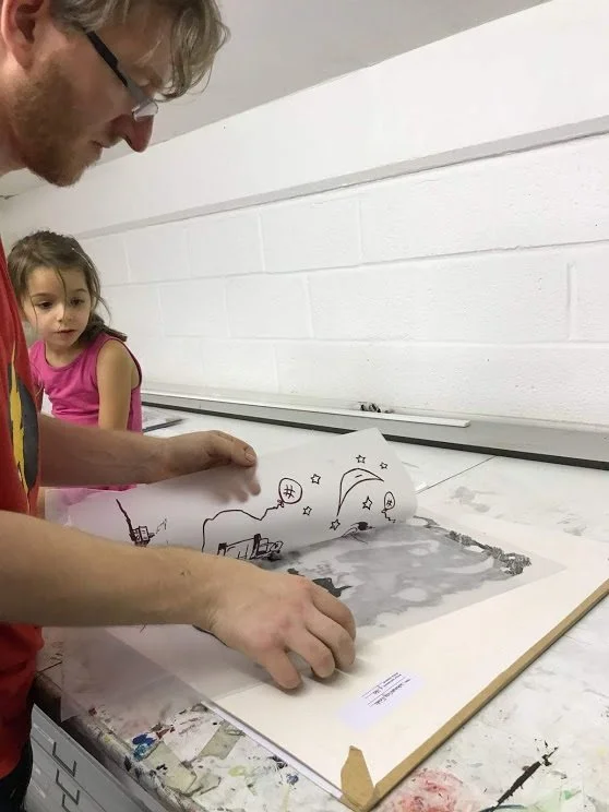 Collector’s limited edition screen print by Rick Clarke. Hand printed, hand coloured art for sale. Based on the theme of family and new born sons and daughters.